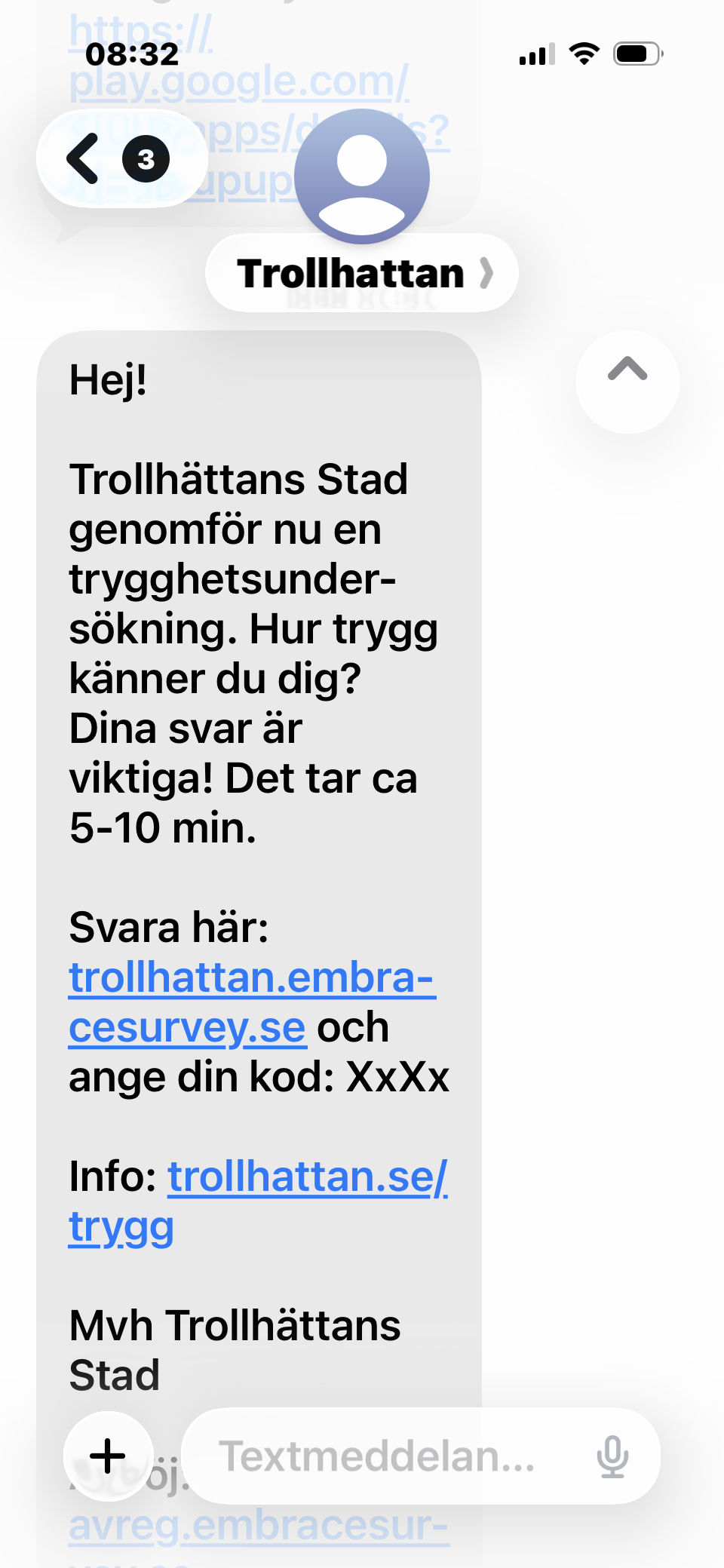Om du får ett SMS av oss som ser ut såhär kan du vara lugn! Så länge länken är "trollhattan.embracersurvey.se" är det riskfritt att klicka. Det är inget bluff-sms utan Trollhättans stads trygghetsundersökning. Hjälp oss göra Trollhättan tryggare genom att svara på vår undersökning.